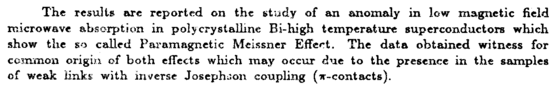 The results arc reported on the study of an anomaly in low magnetic field microwave absorption in poly crystalline Bi-higb temperature superconductors which show the so called Paramagnetic Mcissner Effect. The data obtained witness for common origin of both effects which may occur due to the presence in the samples of weak links with inverse Josephs on coupling (w-contacts).