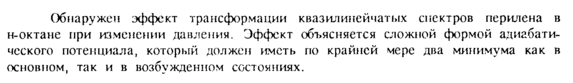 Обнаружен эффект трансформации квазилинейчатых спектров перилена в н-октане при изменении давления. Эффект объясняется сложной формой адиабатического потенциала, который должен иметь по крайней мере два минимума как в основном, так и в возбужденном состояниях.