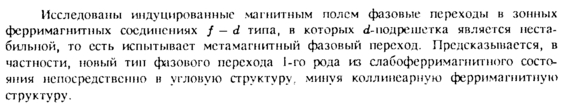 Исследованы индуцированные магнитным полем фазовые переходы в зонных ферримагнитных соединениях f — d типа, в которых 4-под решетка является нестабильной, то есть испытывает мета магнитный фазовый переход. Предсказывается, в частности, новый тип фазового перехода 1-го рода из слабоферримагнитного состояния непосредственно в угловую структуру, минуя коллинсарную ферримагнитную структуру.
