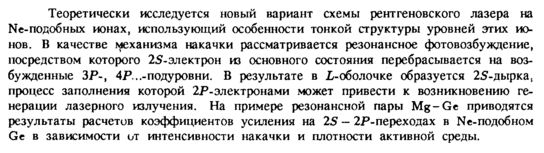 Теоретически исследуется новый вариант схемы рентгеновского лазера на Ne-подобных ионах, использующий особенности тонкой структуры уровней этих ионов. В качестве механизма накачки рассматривается резонансное фотовозбуждение, посредством которого 25-электрон из основного состояния перебрасывается на возбужденные ЗР-, 4Р...-подуровни. В результате в L-оболочке образуется 25-дырка, процесс заполнения которой 2Р-электронами может привести к возникновению генерации лазерного излучения. На примере резонансной пары Mg-Gc приводятся результаты расчетов коэффициентов усиления на 25 — 2Р-переходах в Ne-подобном Ge в зависимости от интенсивности накачки и плотности активной среды.