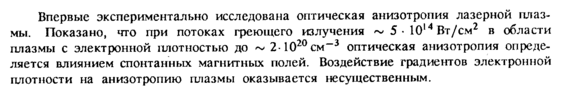 Впервые экспериментально исследована оптическая анизотропия лазерной плазмы. Показано, что при потоках греющего излучения ~ 5 · 1014 Вт/см2 в области плазмы с электронной плотностью до ~ 2-102Осм-3 оптическая анизотропия определяется влиянием спонтанных магнитных полей. Воздействие градиентов электронной плотности на анизотропию плазмы оказывается несущественным.