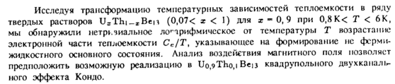 Исследуя трансформацию температурных зависимостей теплоемкости в ряду твердых растворов U3Thi_xBen (0,07< χ < 1) для χ 0, 9 при 0,8К< Τ < 6К, мы обнаружили нетривиальное логарифмическое от температуры X возрастание электронной части теплоемкости Се/Т, указывающее на формирование не ферми-жидкостного основного состояния. Анализ воздействия магнитного поля позволяет предположить возможную реализацию в U0,9Tho,i Bei3 квадрупольного двухканаль-ного эффекта Кондо.