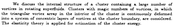 We discuss the internal structure of a cluster containing a large number of vortices in rotating superfluids. Clusters with magic numbers of vortices, in which the triangular vortex array in the interior of the cluster is continuously deformed into a system of concentric layers of vortices at the cluster boundary, are considered. The elasticity theory is applied for estimation of the cluster energy.