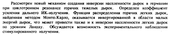 Рассмотрен новый механизм создания инверсии населенности дырок в германии при циклотронном резонансе горячих тяжелых дырок. Определен коэффициент усиления дальнего ИК-из лучения. Функция распределения горячих легких дырок, найденная методом Монте-Карло, оказывается инвертированной в области малых энергий дырок, что может привести также и к инверсии населенности легких дырок по уровням Ландау. Обсуждается возможность экспериментального наблюдения стимулированного излучения.
