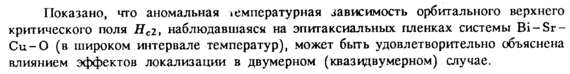 Показано, что аномальная температурная зависимость орбитального верхнего критического поля Нсг, наблюдавшаяся на эпитаксиальных пленках системы Bi-Sr-Cu-0 (в широком интервале температур), может быть удовлетворительно объяснена влиянием эффектов локализации в двумерном (квазидвумерном) случае.