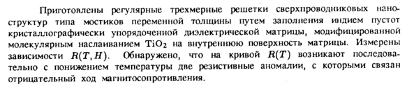 Приготовлены регулярные трехмерные решетки сверхпроводниковых наноструктур типа мостиков переменной толщины путем заполнения индием пустот кристаллографически упорядоченной диэлектрической матрицы, модифицированной молекулярным наслаиванием Т1О2 на внутреннюю поверхность матрицы. Измерены зависимости R(T,H). Обнаружено, что на кривой Я(Г) возникают последовательно с понижением температуры две резистивные аномалии, с которыми связан отрицательный ход магнитосопротивления.