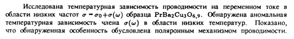 Исследована температурная зависимость проводимости на переменном токе в области низких частот σ~σο+σ(ω) образца РгВа2СизОб,9Обнаружена аномальная температурная зависимость члена σ{ω) в области низких температур. Показано, что обнаруженная особенность обусловлена поляронным механизмом проводимости.