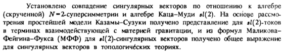 Установлено совпадение сингулярных векторов по отношению к алгебре (скрученной) N-2-суперсимметрии и алгебре Каца-Муди sl(2). На основе рассмотрения простейшей модели Казамы-Сузуки получено представление для в/(2)-токов в терминах взаимодействующей с материей гравитации, и из формул Маликова-Фейгина-Фукса (МФФ) для #{(2)-сингулярных векторов получено общее выражение для сингулярных векторов в топологичёских теориях.