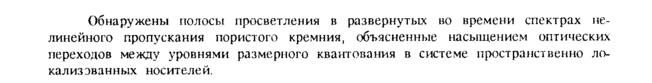 Обнаружены полосы просветления в развернутых во времени спектрах нелинейного пропускания пористого кремния, объясненные насыщением оптических переходов между уровнями размерного квантования в системе пространственно локализованных носителей.