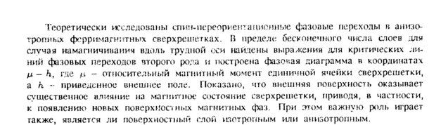 Теоретически исследованы спин-переориентационные фазовые переходы в акизо-тропньж ферримагнитных сверхрешетках. В пределе бесконечного числа слоев для случая намагничивания вдоль трудной оси найдены выражения для критических линий фазовых переходов второго porta и построена фазоная диаграмма в координатах μ h, где μ относительный магнитный момент единичной ячейки сверхрешетки, a h приведенное внешнее поле. Показано, что внешняя поверхность оказывает существенное влияние на магнитное состояние сверхрешетки, приводя, в частности, к появлению новых поверхностных магнитных фаз. При этом важную роль играет также, является ли поверхностный слой изотропным или анизотропным.