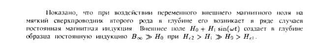 Показано, что при воздействии переменного внешнего магнитного поля на мягкий сверхпроводник второго рода в глубине его возникает в ряде случаев постоянная магнитная индукция Внешнее поле Но + Hi sin(u;i) создает в глубине образца постоянную индукцию Boo > Hq при Нсг > Н\ > Но > Нг\.
