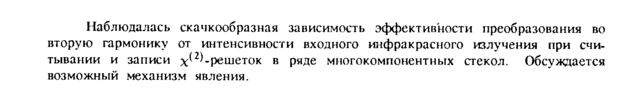 Наблюдалась скачкообразная зависимость эффективности преобразования во вторую гармонику от интенсивности входного инфракрасного излучения при считывании и записи х^2)-решеток в ряде многокомпонентных стекол. Обсуждается возможный механизм явления.