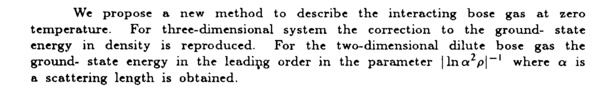 Wc propose a new method to describe the interacting bose gas at zero temperature. For three-dimensional system the correction to the groundstate energy in density is reproduced. For the two-dimensional dilute bose gas the groundstate energy in the leading order in the parameter |lna2/>|-1 where α is a scattering length is obtained.