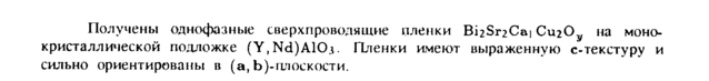 Получены однофазные сверхпроводящие пленки Bi2Sr2Cai СигО.^ на моно-кристаллической подложке (Y.NdjAlOj. Пленки имеют выраженную с-текстуру и сильно ориентированы в (а, Ь)-αϊ ос кости.
