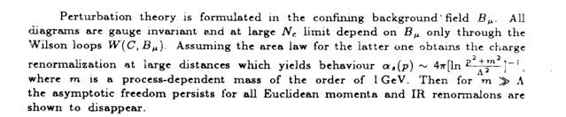 Perturbation theory is formulated in the cormnmg background1 field âÍ. All diagrams are gauge invariant and at large Nc limit depend on Βμ only through the Wilson loops W(C, Βμ). Assuming the area law for the latter one obtains the charge renormalization at large distances which yields behaviour α,(ρ) ~ 4ÔÇ[1Ð ^^"l"> where m is a process-dependent mass of the order of 1 GeV. Then for m >> Λ the asymptotic freedom persists for all Euclidean momenta and IR renormalons are shown to disappear.