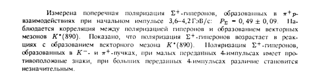 Измерена поперечная поляризация Σ+-гиперонов, образованных в π+ρ-взаимодействиях при начальном импульсе 3,6-4,2 ГэВ/с: -0,49^0,09. Наблюдается корреляция между поляризацией гиперонов и образованием векторных мезонов Я"*(890). Показано, что поляризация Σ+-гиперонов возрастает в реакциях с образованием векторного мезона К*(890). Поляризация Σ+-гиперонов, образованных в К"и 7г+-пучках, при малых переданных 4-импульсах имеет противоположные знаки, при больших переданных 4-импульсах различие становится незначительным.
