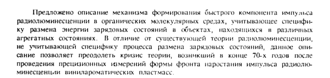 Предложено описание механизма формирования быстрого компонента импульса радиолюминесценции в органических молекулярных средах, учитывающее специфику размена энергии зарядовых состояний в объектах, находящихся в различных агрегатных состояниях. В отличие от существующей теории радиолюминесценции, не учитывающей специфику процесса размена зарядовых состояний, данное описание позволяет преодолеть кризис теории, возникший в конце 70-х годов после проведения прецизионных измерений формы фронта паростания импульса радиолюминесценции винилароматических пластмасс.