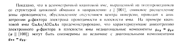 Показано, что в асимметричной квантовой ямс, выращенной из полупроводников со структурой цинковой обманки н направлении ζ \\ [ООП, спиновое расщепление зоны проводимости, обусловленное отсутствием центра инверсии, приводит к анизотропии р-фактора электрона проводимости в плоскости ямы. На примере квантовой ямы GaAs/AlGaAs продемонстрировано, что характеризующие анизотропию электронного ^-фактора в плоскости ямы недиагональные компоненты дху — дух (х || [100]) могут быть соизмеримы по величине с диагональными компонентами 9*χ ~ 9уу ·