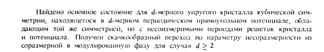 Найдено основное состояние для d-мерного упругого кристалла кубической симметрии, находящегося в d-мерном периодическом прямоугольном потенциале, обладающим той же симметрией, по с несоизмеримыми периодами решеток кристалла и потенциала. Получен скачкообразный переход по параметру несоразмерности из соразмерной в модулированную фазу для случая d > 2.