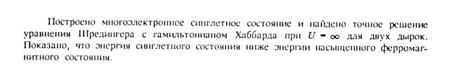Построено многоэлектронное сипглетное состояние и найдено точное решение уравнения Шредингера с гамильтонианом Хаббарда при U оо для двух дырок. Показано, что энергия синглетного состояния ниже энергии насыщенного ферромагнитного состояния.