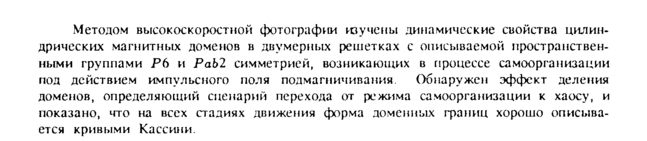 Методом высокоскоростной фотографии изучены динамические свойства цилиндрических магнитных доменов в двумерных решетках с описываемой пространственными группами Р6 и РаЫ симметрией, возникающих в процессе самоорганизации под действием импульсного поля подмагничиваиия. Обнаружен эффект деления доменов, определяющий сценарий перехода от режима самоорганизации к хаосу, и показано, что на всех стадиях движения форма доменных границ хорошо описывается кривыми Кассили.