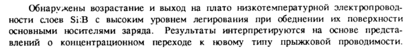 Обнаружены возрастание и выход на плато низкотемпературной электропроводности слоев Si:B с высоким уровнем легирования при обеднении их поверхности основными носителями заряда. Результаты интерпретируются на основе представлений о концентрационном переходе к новому типу прыжковой проводимости.
