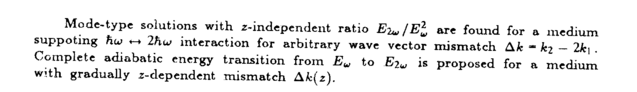 Mode-type solutions with ^-independent ratio E^/El are found for a medium suppoting Ηω 2hu> interaction for arbitrary wave vector mismatch Ak fc2 ~ 2k\ . Complete adiabatic energy transition from Ew to E2u is proposed for a medium with gradually z-dependent mismatch Ak(z).
