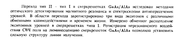 Переход тип II тип I в сверхрешетках GaAs/AlAs исследован методами оптического детектирования магнитного резонанса и спектроскопии антипересеченик уровней, В области перехода зарегистрировано три вида экситонов с различными обменными взаимодействиями и временем жизни. Измерено обменное расщепление экситонных уровней в сверхрешетках типа I. Регистрация нерезонансного воздействия СВЧ поля на люминесценцию сверхрешеток GaAs/AlAs позволила установить сложную структуру линии излучения.