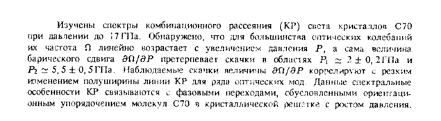 Изучены спектры комбинационного рассеяния (КР) света кристаллов С70 при давлении до ПГПа. Обнаружено, что для большинства оптических колебаний их частота Π линейно возрастает с увеличением давления Р, а сама величина барического сдвига дП/дР претерпевает скачки в областях Pi ~ 2 ±0,2ГШ и Рг ~ 5, 5 ± 0, 5ГПа. Наблюдаемые скачки величины ЭП/дР коррелируют с резким изменением полуширины линии КР для ряда оптических мод. Данные спектральные особенности КР связываются с фазовыми переходами, обусловленными ориентаци-онным упорядочением молекул С70 в кристаллической решетке с ростом давления.