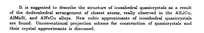 It is suggested to describe the structure of icosahedral quasicrystals as a result of the dodecahedral arrangement of closest atoms, really observed in the AlLiCu, AlMnSi, and AlFeCu alloys. New cubic approximants of icosahedral quasicrystals are found. Unconventional projection scheme for construction of quasicrystals and their crystal approximants is discussed.
