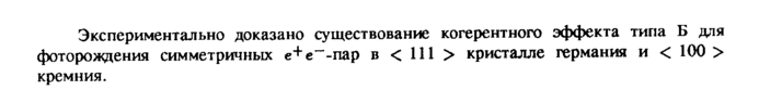 Экспериментально доказано существование когерентного эффекта типа Б для фоторождения симметричных е+е~-пар в < 111 > кристалле германия и < 100 > кремния.