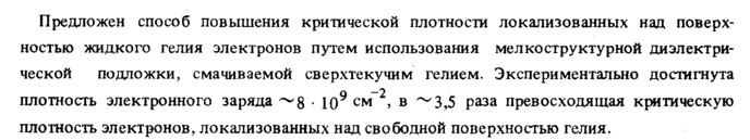 Предложен способ повышения критической плотности локализованных над поверхностью жидкого гелия электронов путем использования мелкоструктурной диэлектрической подложки, смачиваемой сверхтекучим гелием. Экспериментально достигнута плотность электронного заряда ^8 ■ 109 см 2> в ^3,5 раза превосходящая критическую плотность электронов, локализованных над свободной поверхностью гелия.