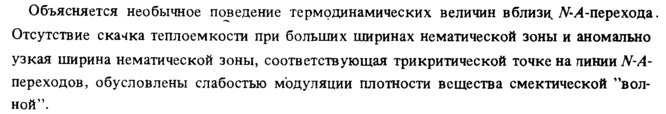 Объясняется необычное поведение термодинамических величин вблизи. ЛМ-перехода. Отсутствие сказка теплоемкости при больших ширинах нематической зоны и аномально узкая ширина нематической зоны, соответствующая трикритической точке на пинии Ν-Λ-переходов, обусловлены слабостью модуляции плотности вещества смектической "волной".