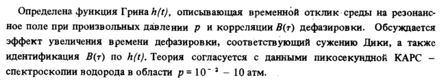 Определена функция Грина h(t), описывающая временной отклик среды на резонансное поле при произвольных давлении ρ и корреляции В(т) дефазировки. Обсуждается эффект увеличения времени дефазировки, соответствующий сужению Пики, а также идентификация В(т) по h(t). Теория согласуется с данными пикосекундной КАРС -спектроскопии водорода в области р=10~2-10 атм.