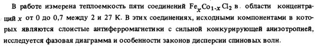 В работе измерена теплоемкость пяти соединений Fe Со1.ЛС12 в. области концентра•Л- ций х от 0 до 0,7 между 2 и 27 К. В этих соединениях, исходными компонентами в которых являются слоистые антиферромагнетики с сильной конкурирующей анизотропией, исследуется фазовая диаграмма и особенности законов дисперсии спиновых волн.