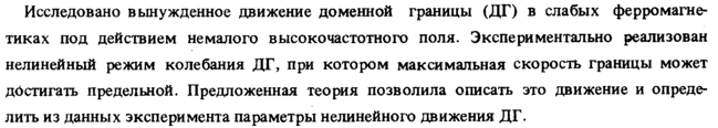Исследовано вынужденное движение доменной границы (ДГ) в слабых ферромагнетиках под действием немалого высокочастотного поля. Экспериментально реализован нелинейный режим колебания ДГ, при котором максимальная скорость границы может достигать предельной. Предложенная теория позволила описать это движение и определить из данных эксперимента параметры нелинейного движения ДГ.