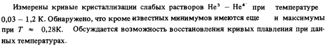 Измерены кривые кристаллизации слабых растворов Не3 — Не4 при температуре 0,03 1,2 К. Обнаружено, что кроме известных минимумов имеются еще и максимумы при Τ « 0,28К. Обсуждается возможность восстановления кривых плавления при данных температурах.