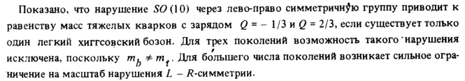 Показано, что нарушение 56>(10) через лево-право симметричною группу приводит к равенству масс тяжелых кварков с зарядом q = 1/3 и q = 2/3, если существует только один легкий хиггсовский бозон. Для трех поколений возможность такого "нарушения исключена, поскольку тьФт{. Для большего числа поколений возникает сильное ограничение на масштаб нарушения L ^-симметрии.