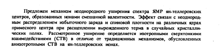 Предложен механизм неоднородного уширения спектра ЯМ Ρ ян-теллеровских центров, образованных ионами смешанной валентности. Эффект связан с неоднородным распределением избыточного заряда и спиновой плотности на различных ядрах примесного центра при расщеплении вырожденного терма в случайных кристаллических полях. Рассмотренное уширение определяется изотропными сверхтонкими взаимодействиями (СТВ) в отличие от традиционных механизмов, обусловленных анизотропными СТВ на ян-теллеровских ионах.