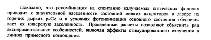 Показано, что рекомбинация на спонтанно излучаемых оптических фононах приводит к значительной населенности состояний мелких акцепторов в лазере на горячих дырках p-Gc и в условиях фотоионизации основного состояния обеспечивает их инверсную заселенность. Проведенные расчеты позволяют объяснить ряд экспериментальных особенностей, включая эффекты стимулированного излучения в линиях примесного поглощения.