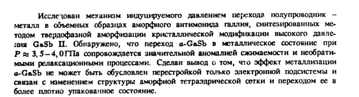 Исследован механизм индуцируемого давлением перехода полупроводник -металл в объемных образцах аморфного антимонида галлия, синтезированных методом твердофазной аморфизации кристаллической модификации высокого давления GaSb П. Обнаружено, что переход α-GaSb в металлическое состояние при Ρ ss 3,5-4, ОПТа сопровождается значительной аномалией сжимаемости и необратимыми релаксационными процессами. Сделан вывод о том, что эффект металлизации α-GaSb не может быть обусловлен перестройкой только электронной подсистемы и связан с изменением структуры аморфной тетраэдрической сетки и переходом ее в более плотно упакованное состояние.