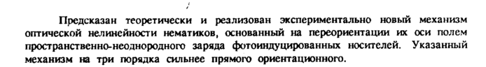 Предсказан теоретически и реализован экспериментально новый механизм оптической нелинейности нематиков, основанный на переориентации их оси полем пространственно-неоднородного заряда фотоиндуцированных носителей. Указанный механизм на три порядка сильнее прямого ориентационного.