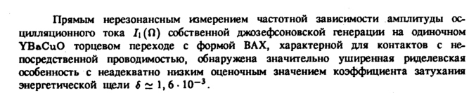 Прямым нерезонансным измерением частотной зависимости амплитуды ос-цилляционного тока Ι\ (Ω) собственной джозефсоновской генерации на одиночном YBftCuO торцевом переходе с формой ΒΑΧ, характерной для контактов с непосредственной проводимостью, обнаружена значительно уширенная риделевская особенность с неадекватно низким оценочным значением коэффициента затухания энергетической щели S ~ 1,6· Ю-3.