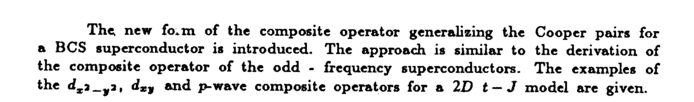 The, new fo^m of the composite operator generalizing the Cooper pairs for a BCS superconductor is introduced. The approach is similar to the derivation of the composite operator of the odd frequency superconductors. The examples of the dxa_y2, dxy and p-wave composite operators for a 2D t — J model are given.