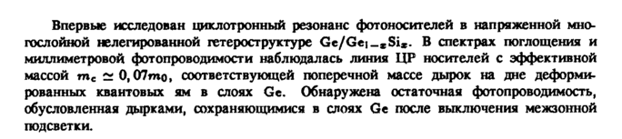 Впервые исследован циклотронный резонанс фотоносителей в напряженной многослойной нелегированной гетероструктуре Ge/Gei_xSiz. В спектрах поглощения и миллиметровой фотопроводимости наблюдалась линия ЦР носителей с эффективной массой тс — 0,07то, соответствующей поперечной массе дырок на дне деформированных квантовых ям в слоях Ge. Обнаружена остаточная фотопроводимость, обусловленная дырками, сохраняющимися в слоях Ge после выключения межзонной подсветки.