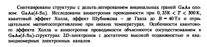 Синтезированы структуры с дельта-легированием вицинальных граней GaAs оловом: GaAs(£-Sn). Исследованы анизотропия проводимости при О, 35К < Г < 300К, квантовый эффект Холла, эффект Шубникова де Гааза до В 40Тл и отрицательное магнитосопротивление при низких температурах. Особенности квантового эффекта Холла и анизотропия проводимости объясняются сосуществованием в GaAs(tf-Sn)-структурах 2D-электронов с достаточно высокой подвижностью и квазиодномерных электронных каналов.