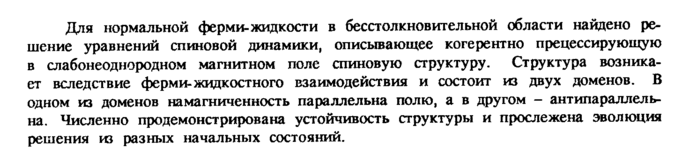 Для нормальной ферм ижидкости в бесстолкновительной области найдено решение уравнений спиновой динамики, описьгоающее когерентно прецессируюшую в слабонеоднородном магнитном поле спиновую структуру. Структура возникает вследствие ферми-жидкостного взаимодействия и состоит из двух доменов. В одном из доменов намагниченность параллельна полю, а в другом антипараллель-на. Численно продемонстрирована устойчивость структуры и прослежена эволюция решения из разных начальных состояний.