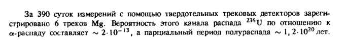 За 390 суток измерений с помощью твердотельных трековых детекторов зарегистрировано 6 треков Mg. Вероятность этого канала распада 236U по отношению к α-распаду составляет ~ 210~13, а парциальный период полураспада ~ 1,2 1020яет.