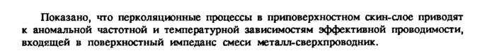 Показано, что перколяционные процессы в приповерхностном скин-слое приводят к аномальной частотной и температурной зависимостям эффективной проводимости, входящей в поверхностный импеданс смеси металл-сверхпроводник.