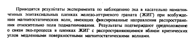 Приводятся результаты эксперимента по наблюдению эха в касательно намагниченных эпитаксиальных пленках железо-иттриевого граната (ЖИГ) при возбуждении магнитостатических волн, имеющих фиксированные направления распространения относительно поля подмагничивания. Результаты подтверждают предположение о связи эхо-процесса в пленках ЖИГ с распространяющимися вблизи критических углов медленными поверхностными магнитостатическими волнами.